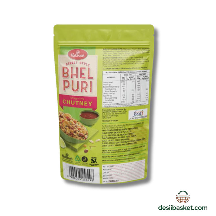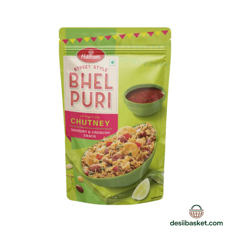 Haldiram's Bhelpuri with Chutney is an iconic Mumbai street-style chaat that bursts with tangy, spicy goodness, blending airy puffed rice, crispy sev, roasted peanuts, and a medley of fresh chutneys for an unbeatable crunch and flavor explosion. Infused with authentic spices like chaat masala, tamarind, and green chilies, this ready-to-eat mix captures the vibrant chaos of Juhu Beach vendors, offering a perfect harmony of sweet, sour, and heat. Made with premium, natural ingredients and no preservatives, it's a vegetarian delight that's light yet satisfying, ideal for monsoon munchies or instant party starters.