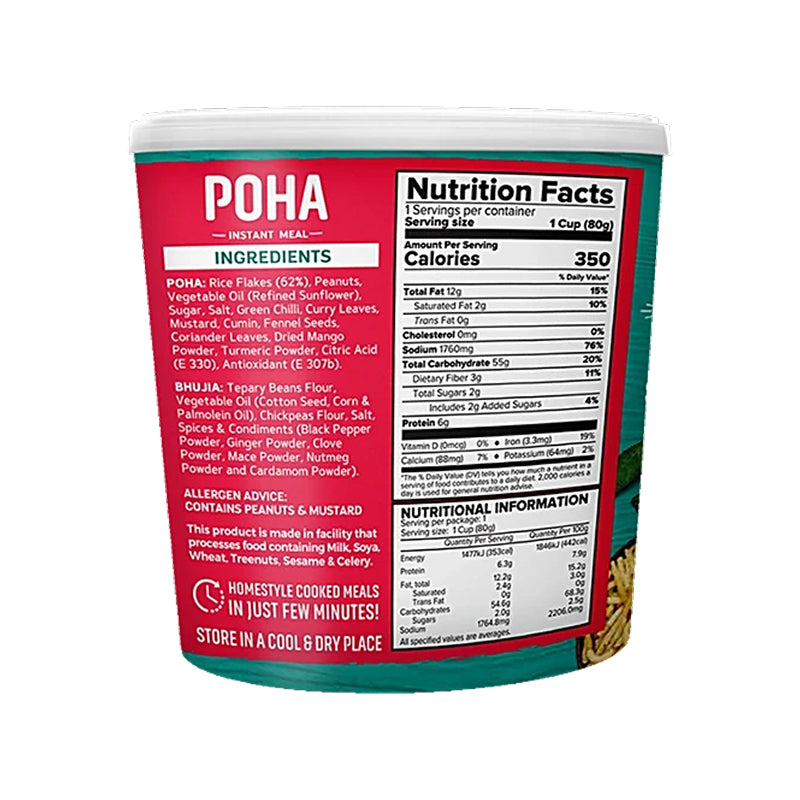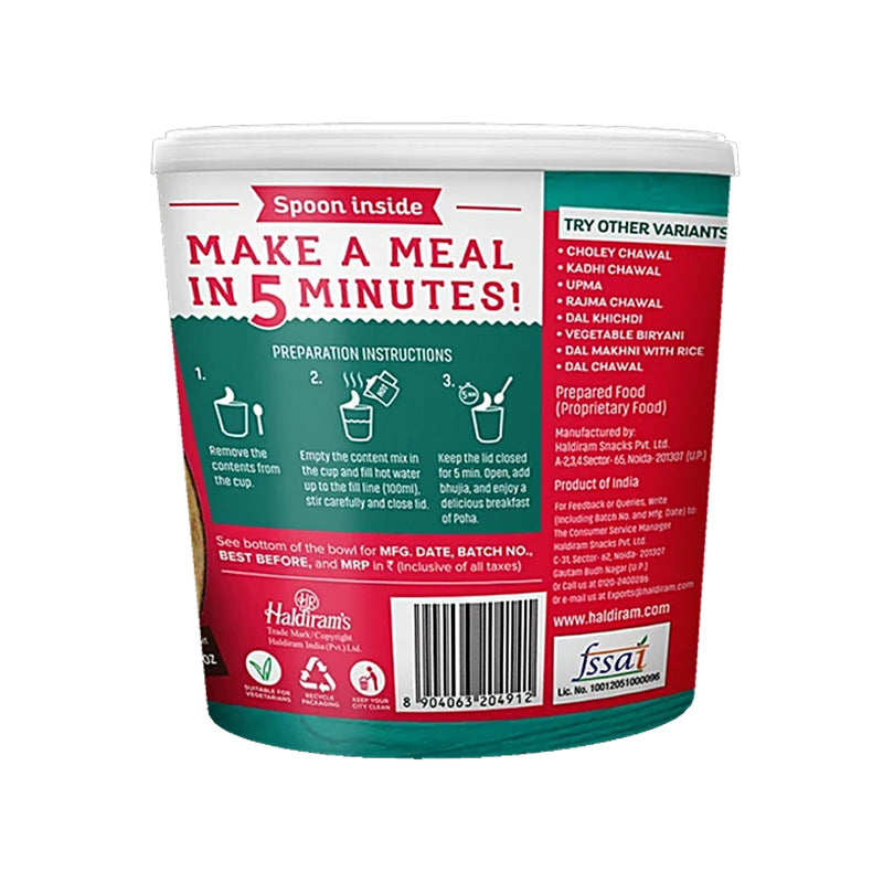 Haldiram's Cup Shup Poha with Bhujia Sachet is a convenient and tasty ready-to-eat breakfast option featuring light and fluffy flattened rice accompanied by a crispy bhujia sachet. Perfect for a quick, flavorful, and satisfying meal at home, work, or on-the-go.