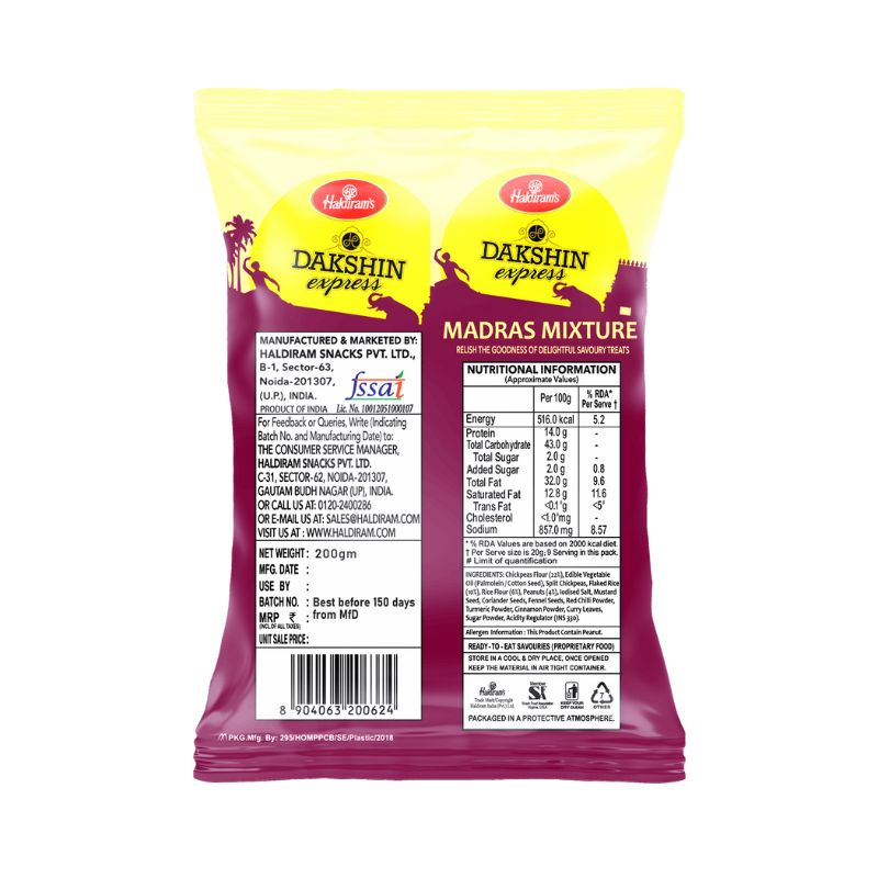 Haldiram’s Dakshin Madras Mixture is a traditional South Indian-style snack mix made with a variety of crispy sev, boondi, peanuts, fried lentils, and aromatic spices. Each bite bursts with a perfect balance of crunch, spice, and authentic Madras flavours, making it a must-have for festive occasions or everyday munching.