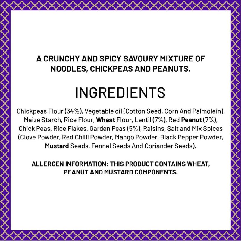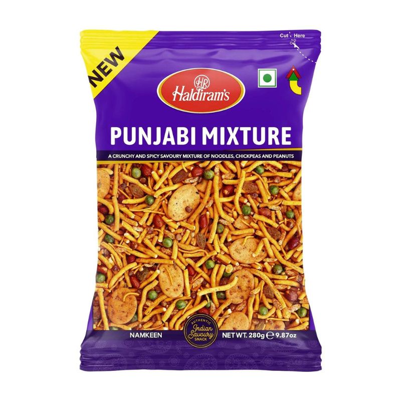 Haldiram's Punjabi Mixture is a vibrant, crunchy namkeen mix packed with bold Punjabi flavors, featuring crispy gram flour (besan) sev, roasted peanuts, lentils, and a zesty blend of spices like cumin, red chili, and tangy amchur. This savory snack offers a delightful balance of spice and crunch, making it a perfect tea-time treat or party snack. Crafted with authentic ingredients, it captures the lively essence of North Indian street food culture.