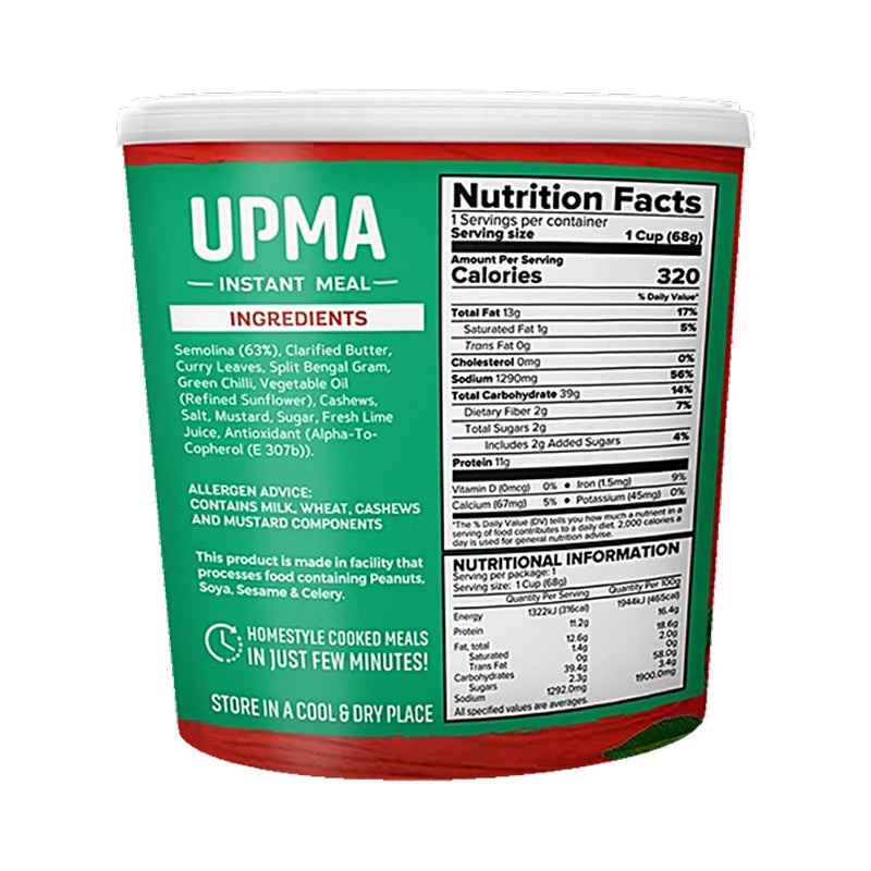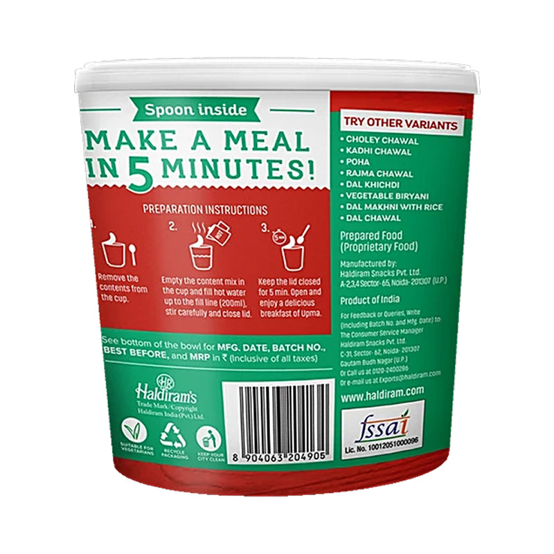 Haldiram's Vegetable Upma is a ready-to-cook South Indian delicacy made with fine semolina and a mix of vegetables. Light, fluffy, and mildly spiced, this wholesome dish is perfect for a healthy breakfast, light lunch, or evening snack. Quick and convenient, it brings the authentic taste of traditional upma to your table in minutes.