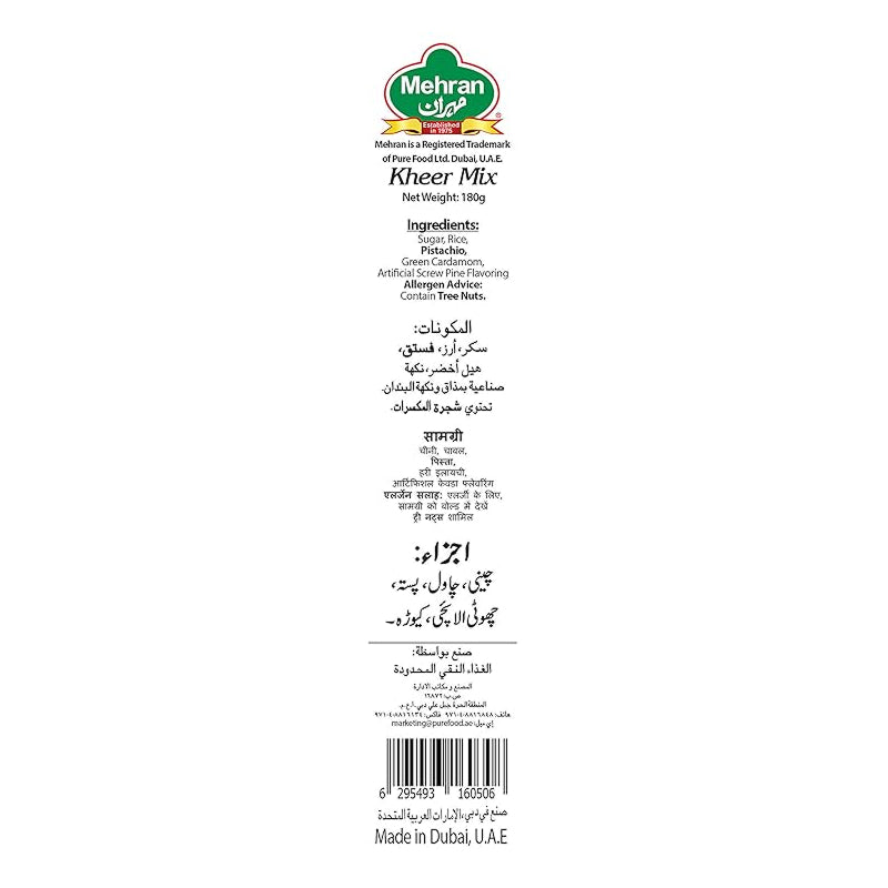 Mehran Kheer Mix is a delightful blend crafted to create creamy, authentic Indian rice pudding in minutes, capturing the rich flavors of traditional kheer. Made with premium rice, sugar, pistachios, and aromatic green cardamom, this mix delivers a velvety texture and sweet, nutty taste cherished in Indian households. Perfect for festive celebrations like Diwali or everyday indulgence, it brings the essence of South Asian desserts to your table with ease.