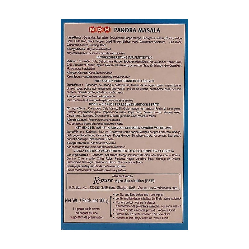 MDH Pakora Masala is a special spice blend crafted with aromatic spices to enhance the flavor and aroma of vegetable or paneer pakoras. It brings a deliciously spiced and crunchy taste to your fried snacks, making them irresistible.