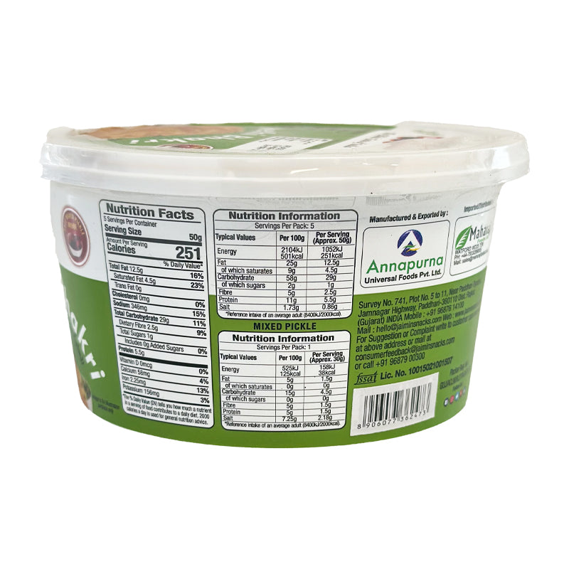 Savor the wholesome crunch of Jaimin Methi Bhakri, a traditional Gujarati flatbread crafted from wheat flour and aromatic fenugreek leaves (methi), offering a delightful blend of earthy, slightly bitter flavors with a crispy texture. Infused with natural spices like cumin and ajwain, this healthy snack captures the rustic charm of Gujarat’s village kitchens, where bhakri is a beloved staple. Made with natural ingredients and no artificial preservatives, it’s a nutritious, vegetarian treat perfect for pairing with tea or pickles, bringing authentic desi flavors to your snack time.