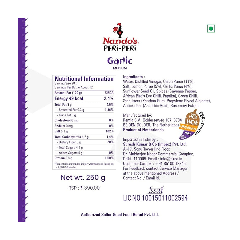 Nando's Peri Peri Chilli Sauce – Garlic is a spicy and aromatic sauce made with fiery Peri Peri peppers blended with garlic. Perfect for adding zesty flavor and heat, it enhances marinades, dips, and a variety of dishes with a bold and tangy kick.