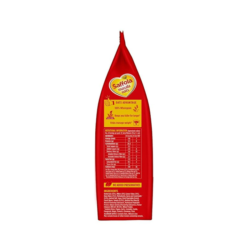 Saffola Masala Oats Tomato Twist is a savory, instant oats mix flavored with tangy tomato and mild spices. Quick and easy to prepare, it offers a wholesome, nutritious, and flavorful meal or snack suitable for all ages.