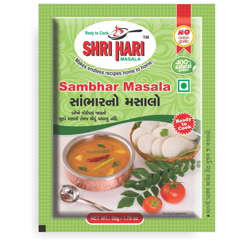 Shri Hari Sambhar Masala is a premium spice blend crafted to create authentic South Indian Sambar at home. Made with a balanced mix of aromatic spices, it enhances the flavor, aroma, and color of lentil and vegetable stews, delivering traditional taste with ease.