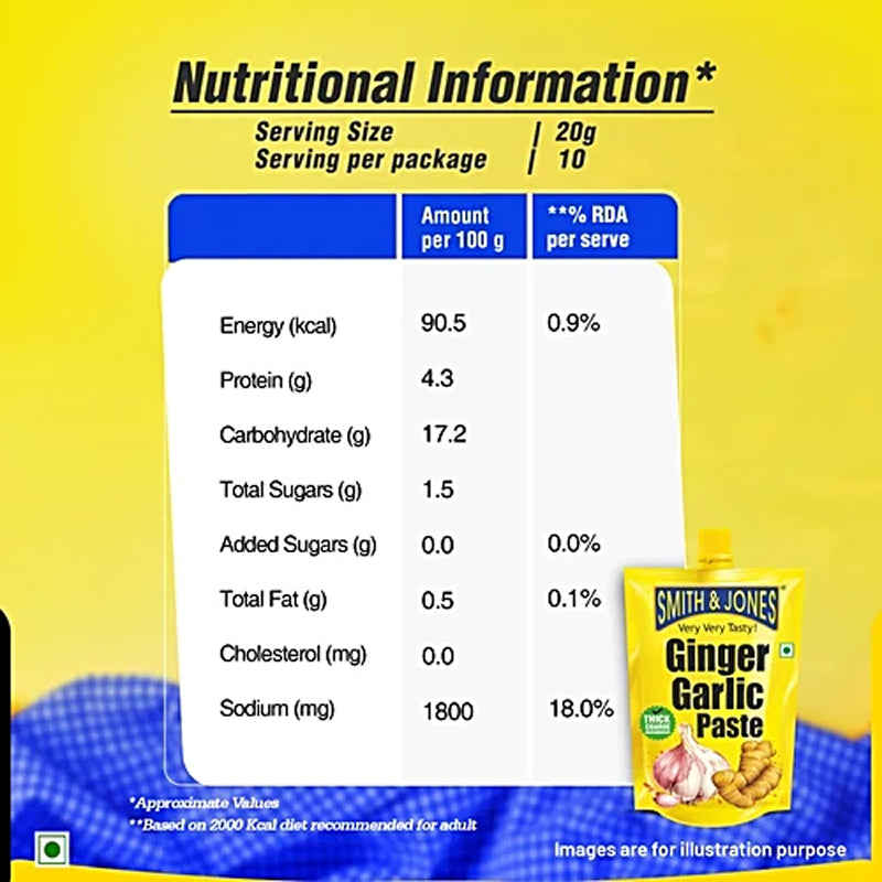 Smith & Jones Ginger Garlic Paste is a ready-to-use kitchen essential made from fresh, high-quality ginger and garlic. It provides a robust flavor and aroma, making it perfect for curries, stir-fries, marinades, and a wide variety of Indian and international dishes.