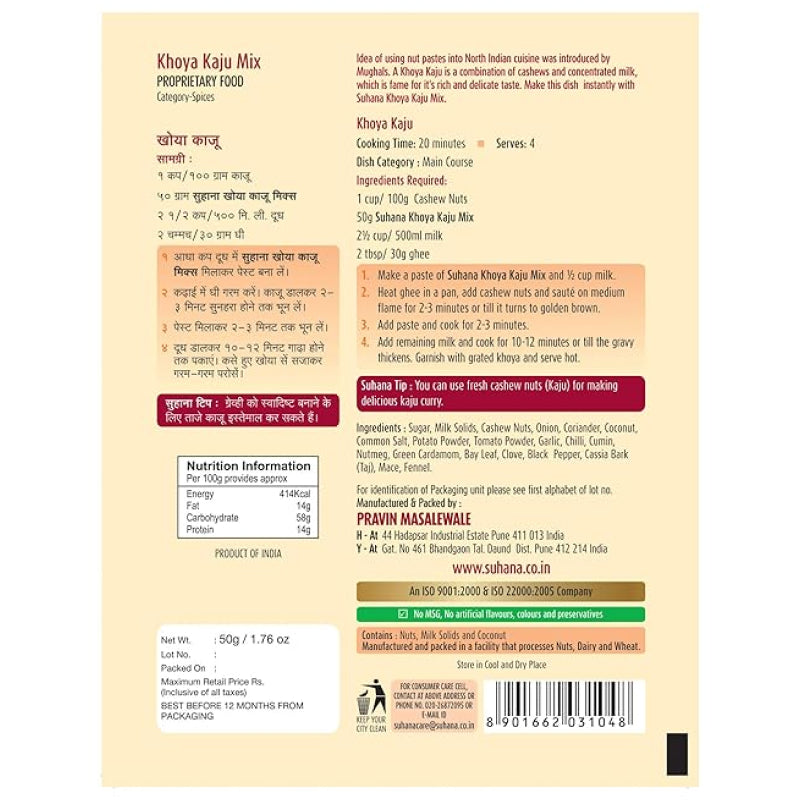 Suhana Khoya Kaju Mix is a premium blend of rich khoya (milk solids) and crunchy cashews, crafted to enhance the taste and texture of festive sweets, desserts, and snacks. Perfect for preparing traditional Indian sweets or enjoying as a delightful treat, it brings authentic flavor to your kitchen creations.